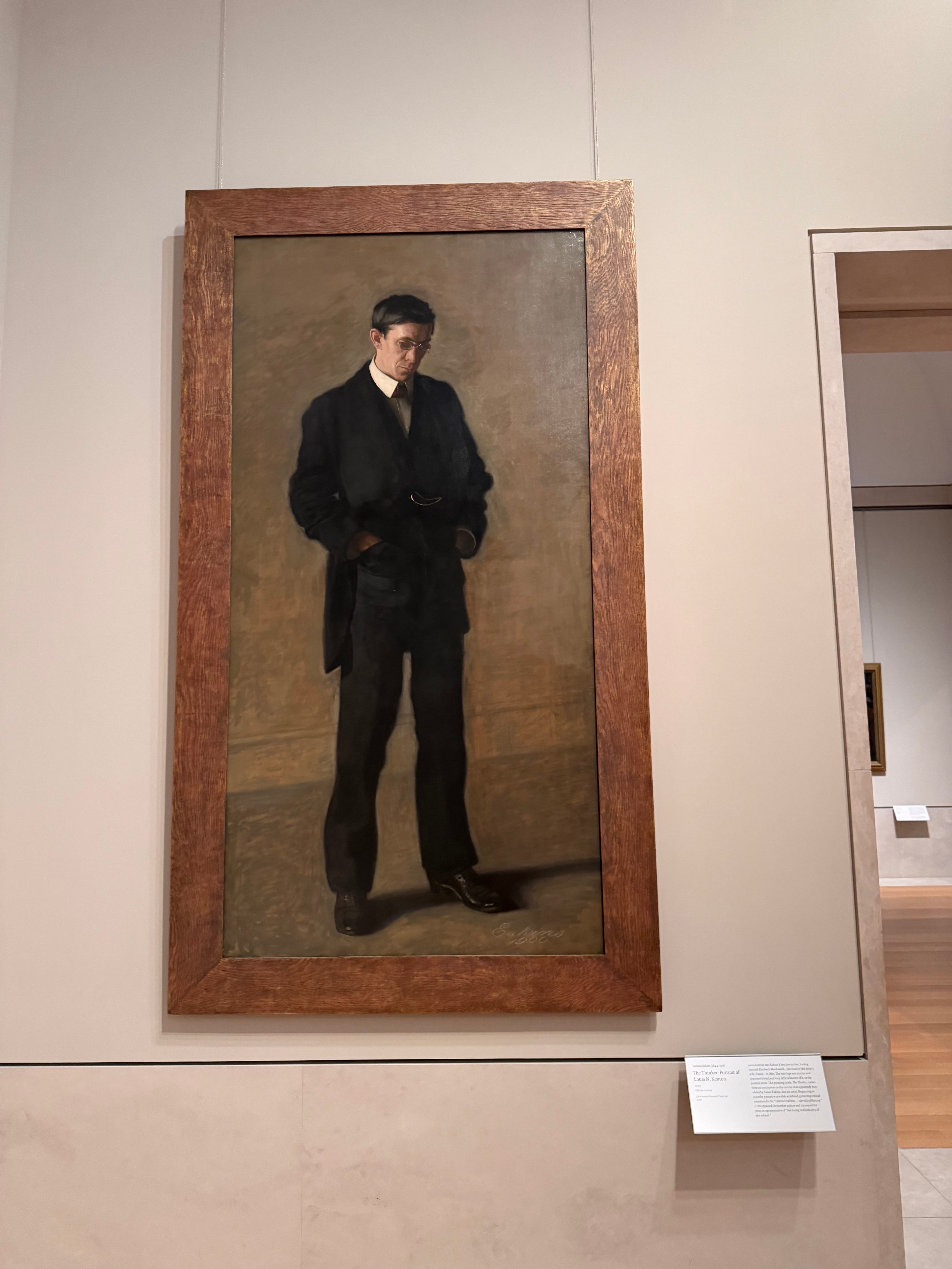 A few days ago, I went to the Met to look at the Thomas Eakins portrait, in the hopes that staring at it in person will reveal something to me about the significance of the novel and its impact on me. I’m a sucker for these kinds of pilgrimages, though historically they’ve given me no answers. I braved a torrential downpour in nice linen pants and walked around the American Wing with my eyes peeled until I stumbled upon it in the corner of a room full of towering portraits by John Singer Sargent. It was the only one without a gilded frame, and the only one of somebody not of some distinguished status. Seeking revelation, I spent several minutes staring in silence, but nothing came to me. After checking out some Winslow Homer paintings, I returned and found a tour guide explaining the backstory of the Sargent portraits. I loitered in the back, hoping he would eventually say something about the inspiration behind the Eakins painting. After several minutes, he declared that they were running out of time, and so they shuffled out of the gallery, right past Louis Kenton. I walked back to the image. From my vantage, he looked larger than life and around seven feet tall, though given the actual dimensions of the painting, he was probably closer to a common six feet.