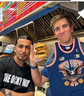 The line from baconeggandcheesesaltpepperketchup to ordering a chopped cheese the ocky way is rife with grifters looking to capitalize on this cultural bastardization. In some ways, we are a meme city as much as we are a real one. Our Manhattan parks are sites of spectacle, where we have celebrity lookalike contests, people chase you down with microphones, and we gather to watch men too afraid to reveal their face eat a jar of cheese balls. You’ll see more photos and videos of people on the subway just minding their own business than you will performers contorting their body for some change. Elsewhere, a truck covered in graffiti serves you deli classics while a pair of Timbs hang from the side mirror. If that doesn’t suit you, grab yourself a gourmet Glizzy, but not from those trucks you see everywhere that upcharge you for bottles of water. If you keep hanging around the viral Italian sandwich shop, you might catch a glimpse of the cast of Italian characters that flirt with self-parody, all in the hopes of flicking up with the golden goose: a concerningly fat Italian child who has become revered as a King Solomon for the modern age. I cannot wait for a sculpture of cooked ground beef in the shape of the Rizzler to be unveiled at the next San Gennaro.